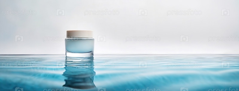 Стеклянная банка с кремом, плавающая на гладкой, спокойной поверхности воды, символизирует чистоту, уход за кожей и спокойную эстетику