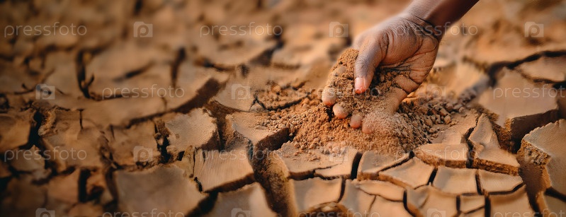 Рука сжимает сухую, потрескавшуюся землю, символизируя засуху и нехватку продовольствия на фоне выжженной, опустошенной земли, олицетворяя стойкость и борьбу