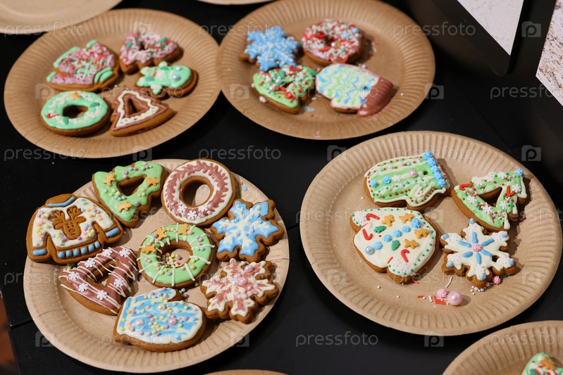 Красиво и празднично украшенное праздничное печенье, разложенное по тарелкам для всеобщего удовольствия