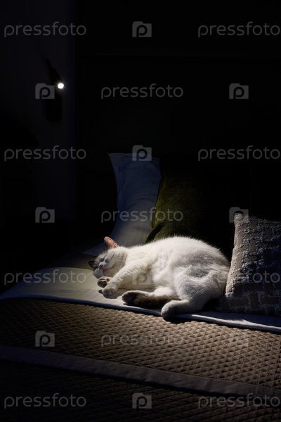 Расслабляющий кот на уютной кровати, окруженный мягким и теплым освещением вечером