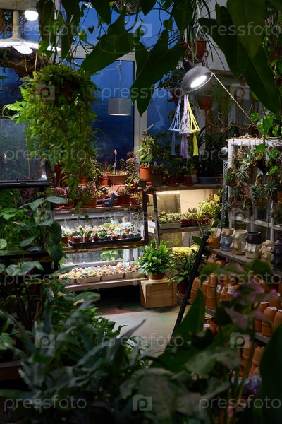 Этот магазин пышных комнатных растений наполнен яркой зеленью и обильным естественным светом