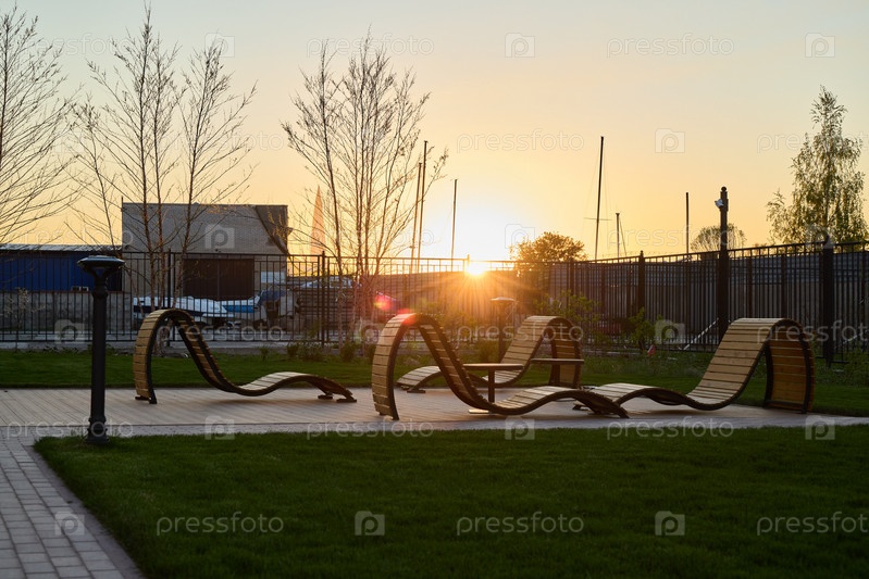 Закат над шезлонгами в тихом парке, идеально подходящем для отдыха и наслаждения природой