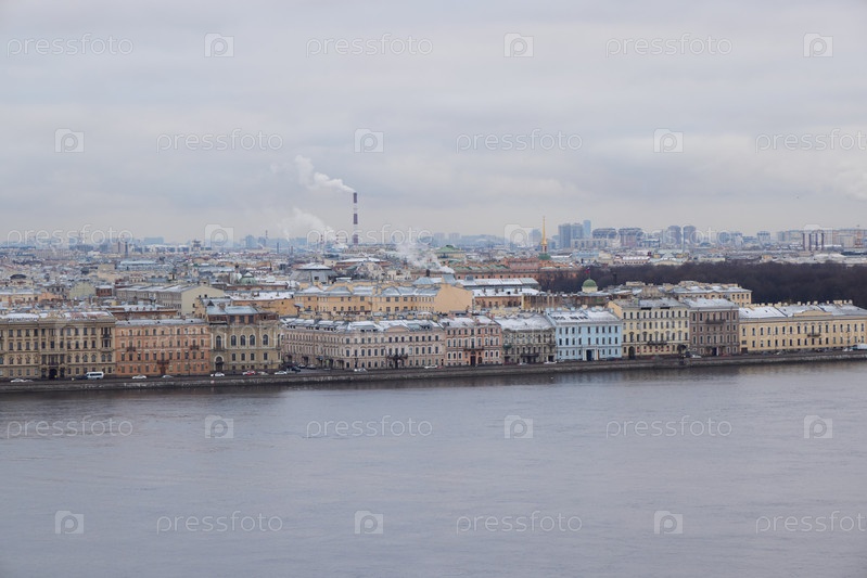 Живописный зимний пейзаж с изображением исторической набережной Санкт-Петербурга, демонстрирующий