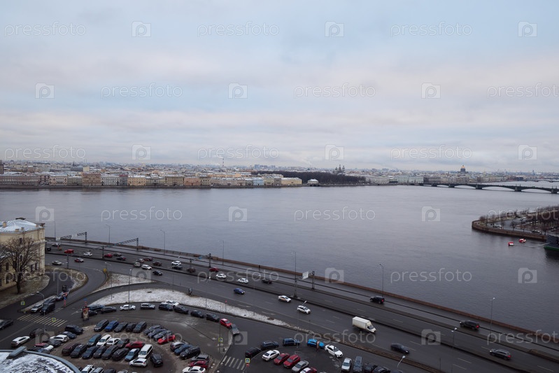 Потрясающий вид на спокойную реку на фоне городского пейзажа в зимний сезон