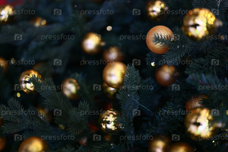 Потрясающие и элегантные золотые украшения, украшающие красивую рождественскую елку, украшенную ярко