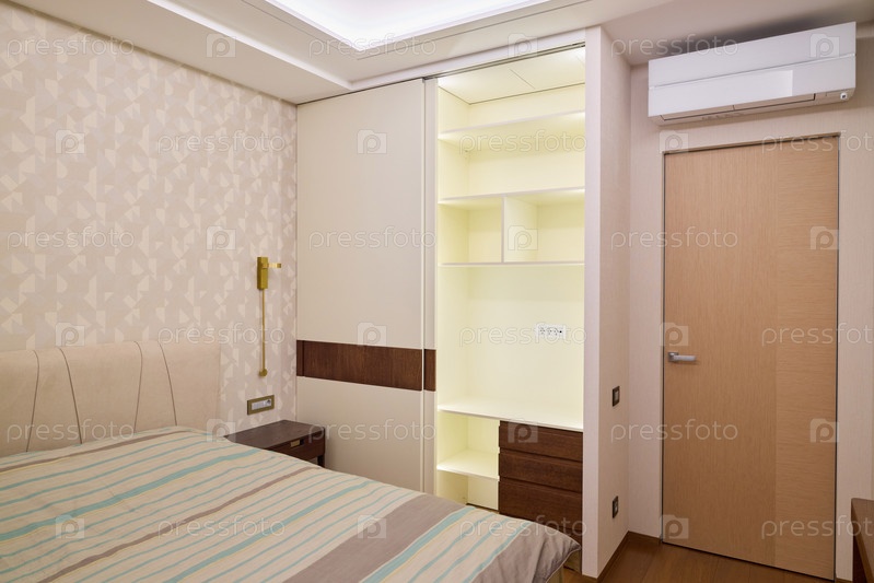 Стильный современный дизайн спальни со встроенным шкафом и эффективным кондиционером