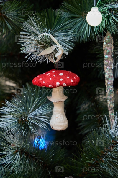 Очаровательное украшение в виде красного гриба, висящее на красивой рождественской елке в праздничный сезон