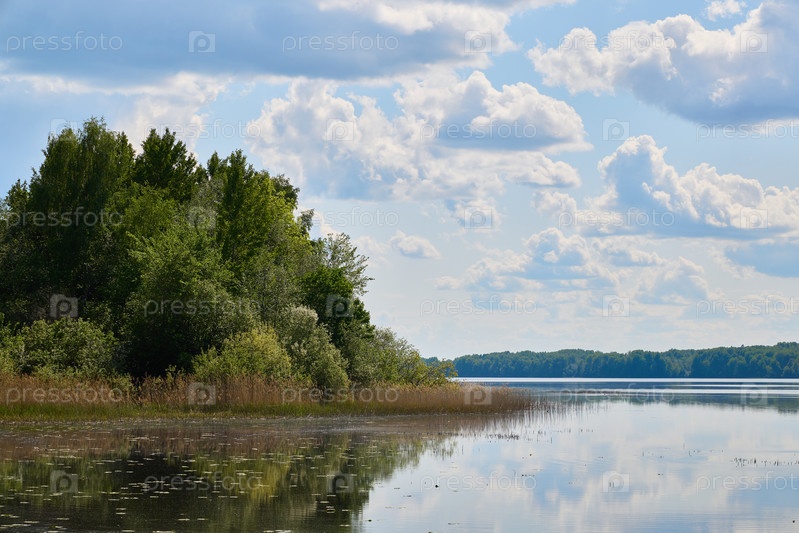 Спокойный озерный пейзаж с пышной зеленью и зеркальной водой, подчеркивающей его красоту