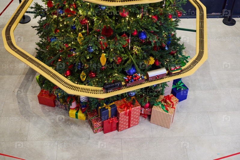 Чудесная праздничная рождественская елка, украшенная подарками, и восхитительный поезд под ней