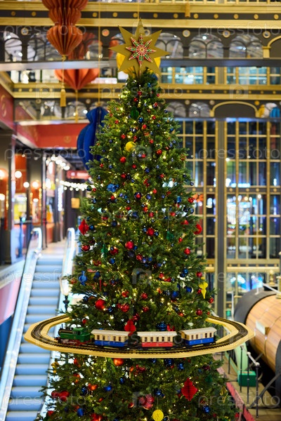 Праздничная рождественская елка, украшенная восхитительными игрушками, и чудесный поезд