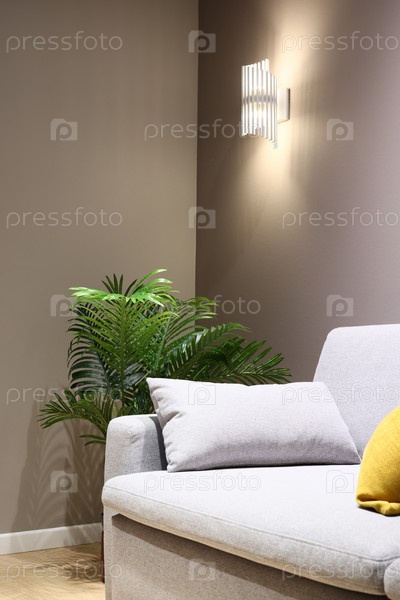 Современная гостиная с уютным диваном и красивым декоративным растением для создания атмосферы