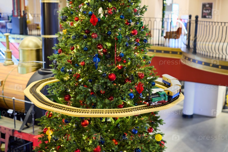 Полюбуйтесь очаровательным праздничным поездом, красиво представленным на рождественской елке