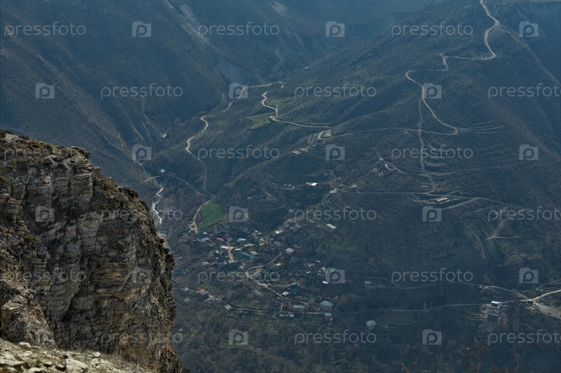 Россия. Северо-восточный Кавказ. Республика Дагестан. Головокружительный панорамный вид на горные серпантины на склонах Сулакского каньона открывается с отвесных скал села Дубки