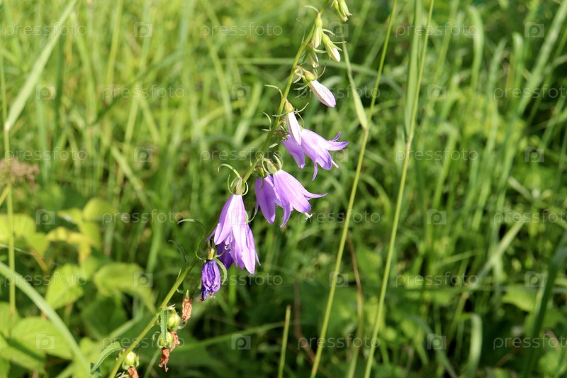 Соцветие колокольчиков в траве на лугу в солнечный день