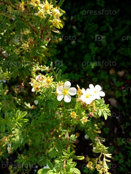 Соцветие белых цветков лапчатки на кусте в солнечном свете