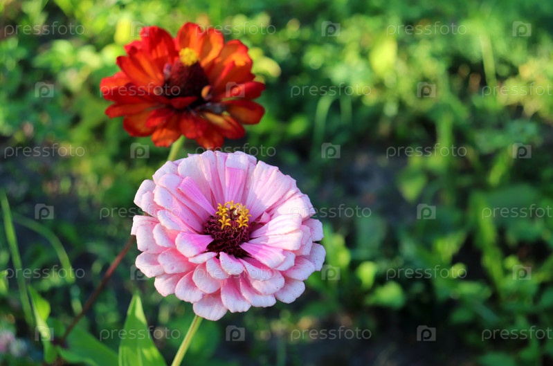 Розовая цинния и увядающая красная цинния на клумбе под осенним солнцем