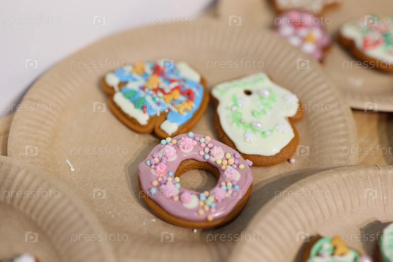 Яркие красочные украшения из печенья на праздничных бумажных тарелках для всеобщего удовольствия