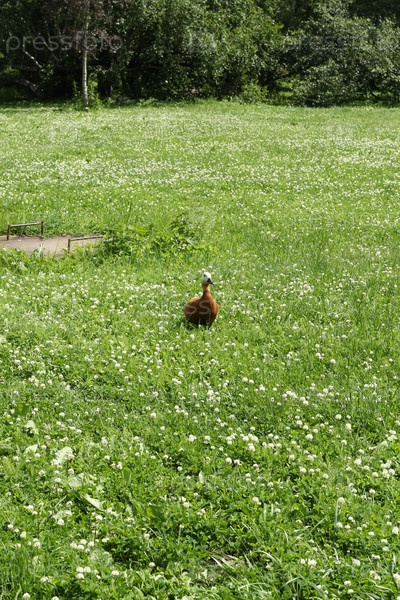 Утка счастливо разгуливает среди пышной и яркой зеленой травы в саду