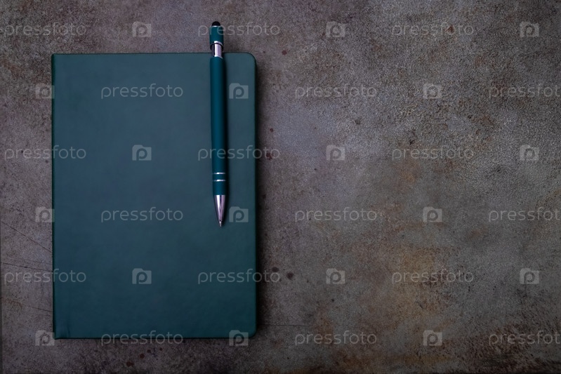 Тетрадь в зеленом переплете на светло-коричневой текстурированной поверхности, в комплекте с ручкой