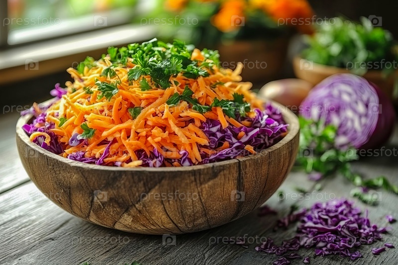Весенний овощной салат с тертой морковью и нашинкованной фиолетовой капустой