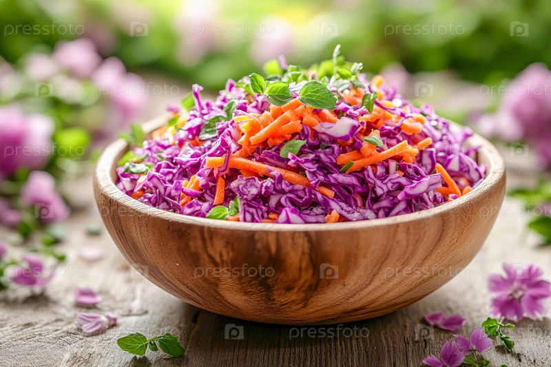 Весенний овощной салат с тертой морковью и нашинкованной фиолетовой капустой