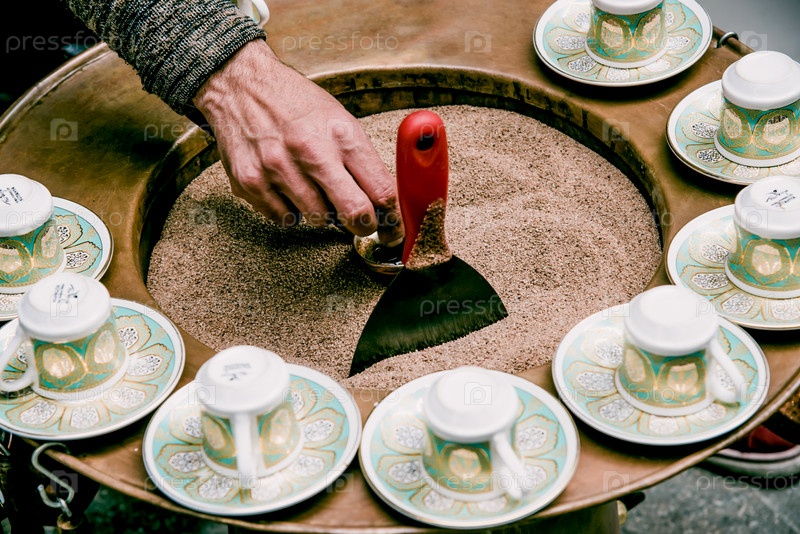 Мужчина готовит турецкий кофе традиционным способом в джезве на песке, уличная еда и напитки