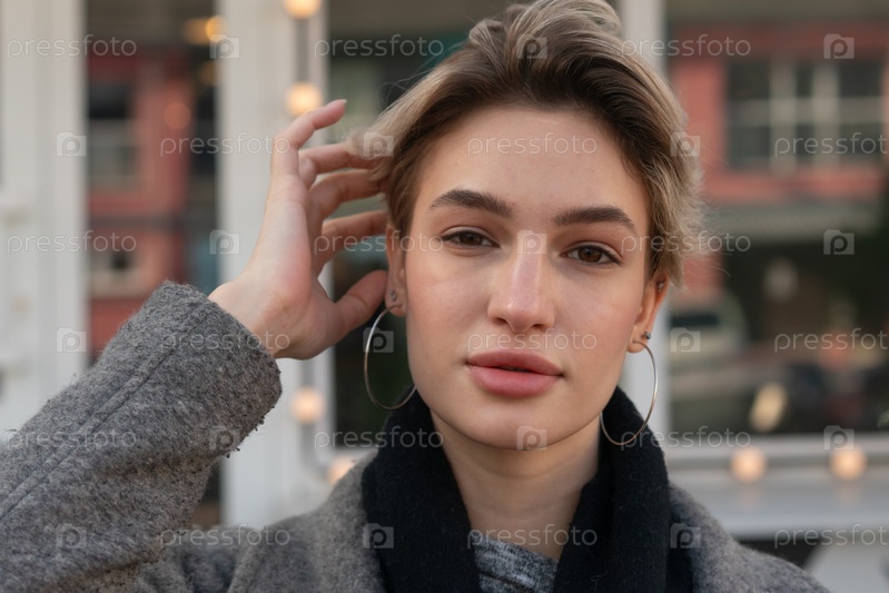 Портрет молодой красивой женщины на улице в сером пальто
