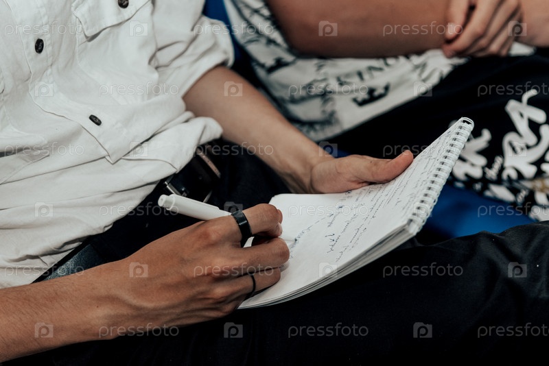 Мужчина-студент пишет заметки в блокноте, рука держит ручку крупным планом