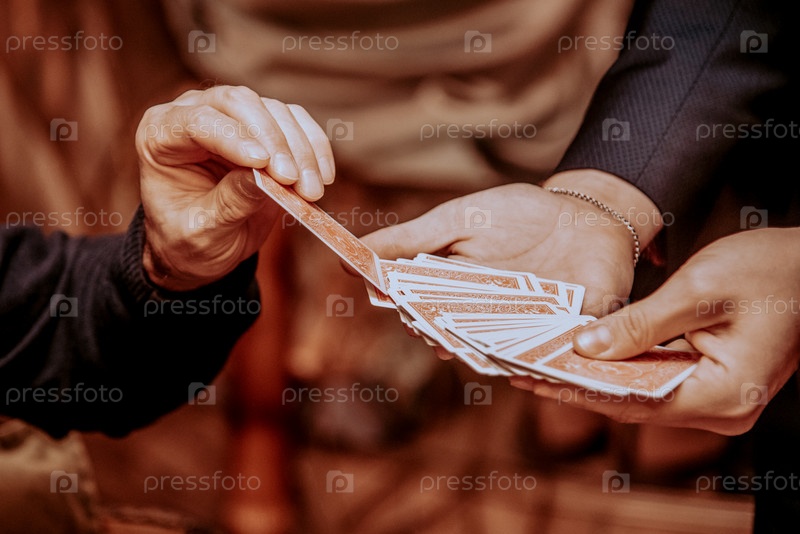 Фокусник показывает карточный фокус, мужчина играет в казино, крупный план руки держат колоду
