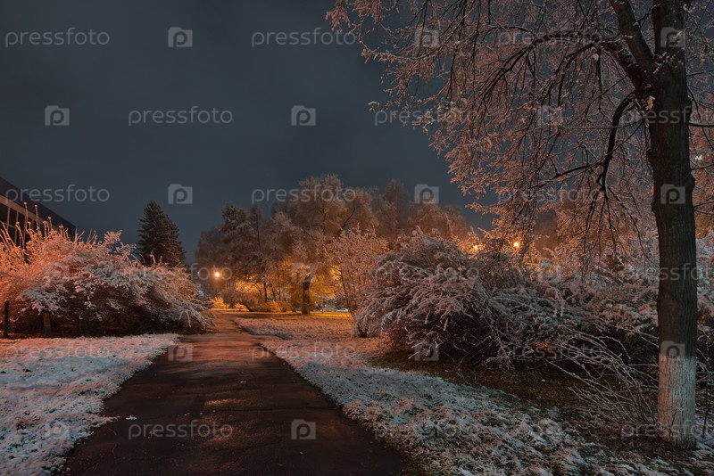 Новокузнецк, Россия. 01 ноября 2024 года. Живописный вид на деревья городского парка, покрытые первым осенним снегом и подсвеченные фонарями теплого и холодного света