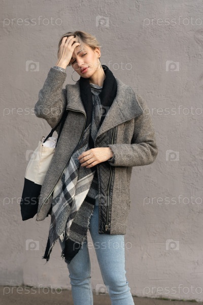Портрет молодой красивой женщины на улице в сером пальто