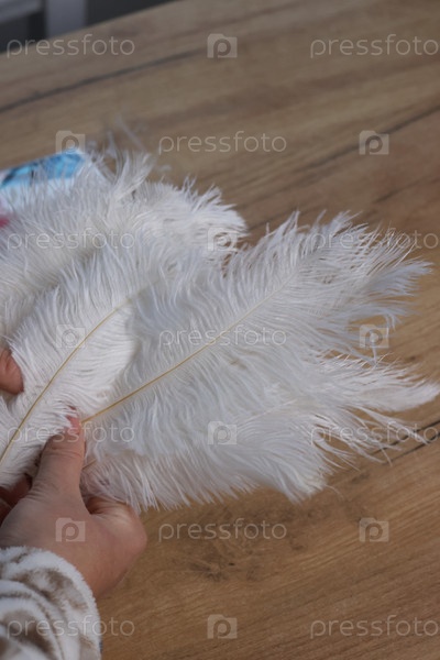 Женщина раскладывает на столе белые перья страуса. Крупный план. Снимок через плечо
