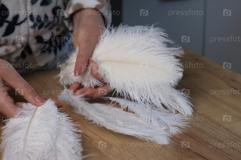 Женщина демонстрирует белые перья страуса. Лежит на столе. Крупный план
