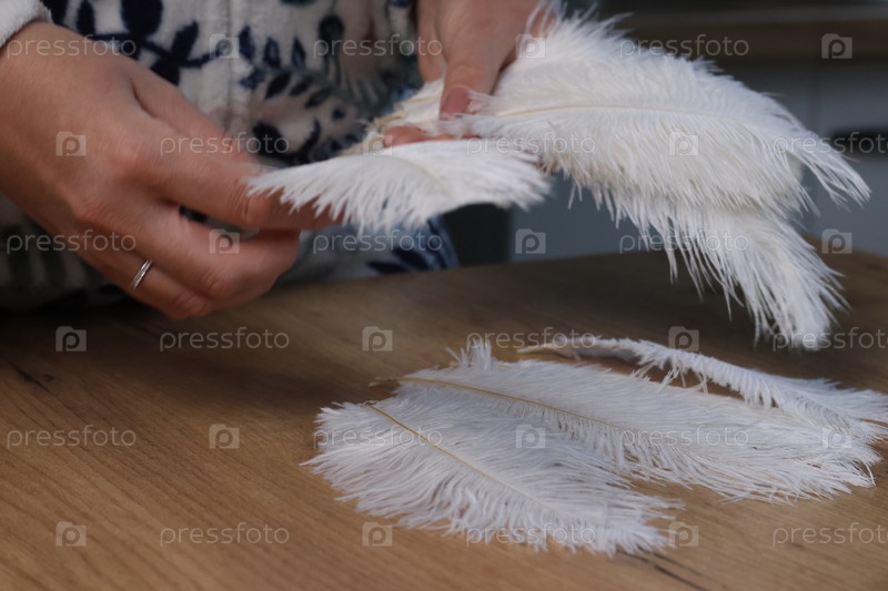 Женщина демонстрирует белые перья страуса. Лежит на столе. Крупный план