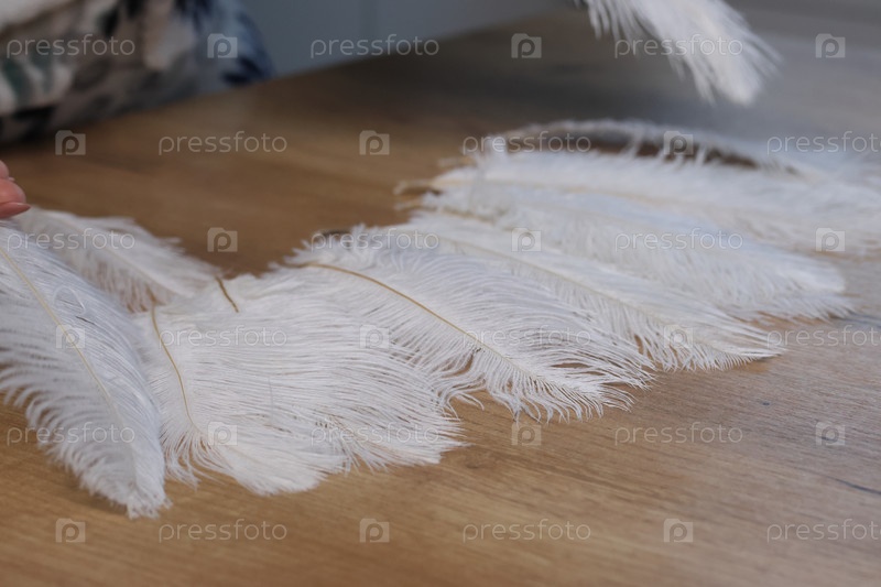 Женщина раскладывает на столе страусиные перья. Перья белые. Косой угол