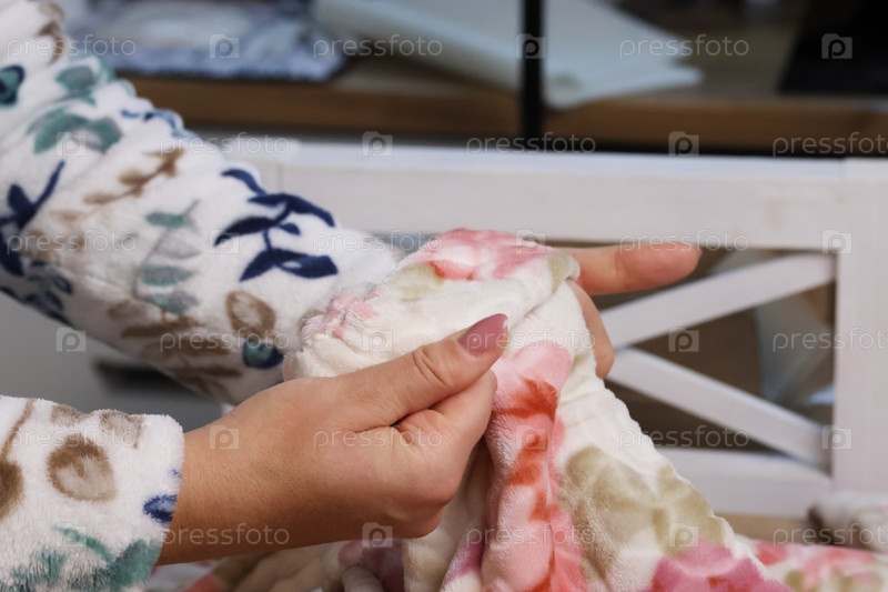 Женщина рассматривает теплый халат. Снято сверху. Демонстрирует рукав. Крупный план