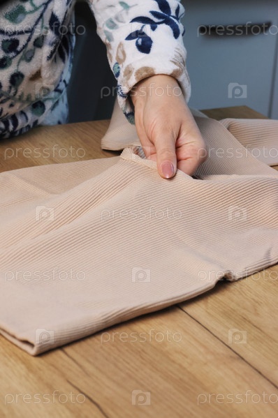 Женщина рассматривает термолеггинсы. Демонстрирует элементы дизайна. Крупный план