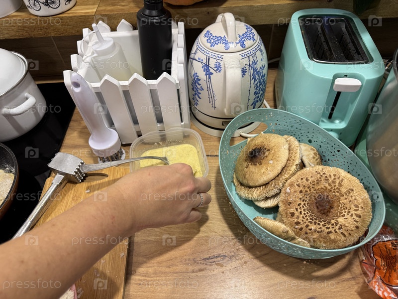 Корзина с грибами с зонтиками. Шляпки грибов. Женщина готовится жарить грибы