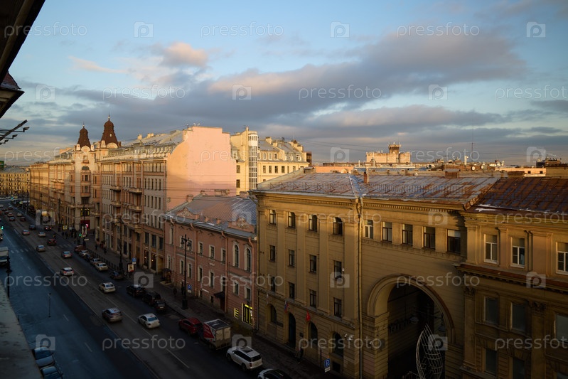Красивый городской пейзаж в сумерках, демонстрирующий историческую архитектуру и движущиеся автомобили