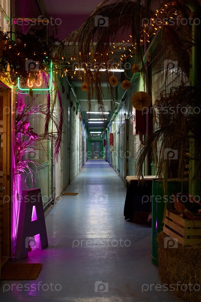 Яркий и динамичный коридор с неоновыми огнями и элементами тропического декора