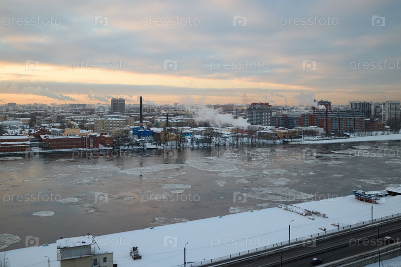 Прекрасная зимняя речная сцена с дымом и льдом на фоне захватывающего городского пейзажа