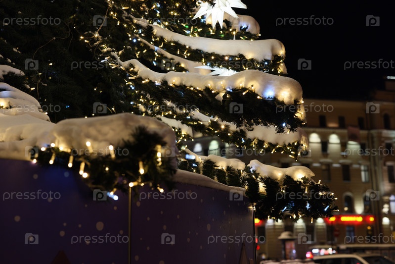 Красивая ночная рождественская елка, украшенная снегом и разноцветными огнями