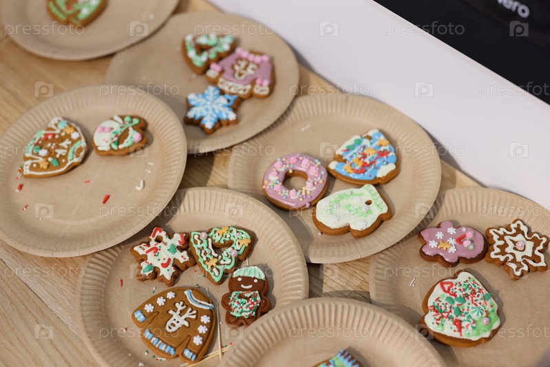 Тарелки с пряничным печеньем, украшенные к праздникам и торжествам