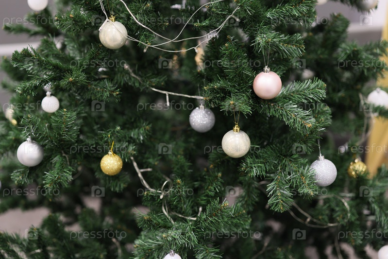 Украшенная рождественская елка с разноцветными игрушками и огнями в честь радостного сезона