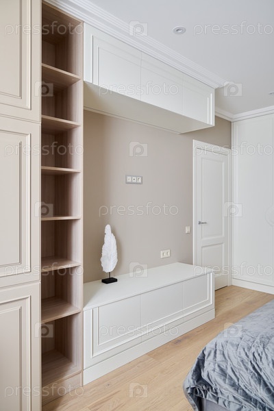 Это элегантный и современный минималистский дизайн спальни, подчеркивающий эффективные решения для хранения вещей