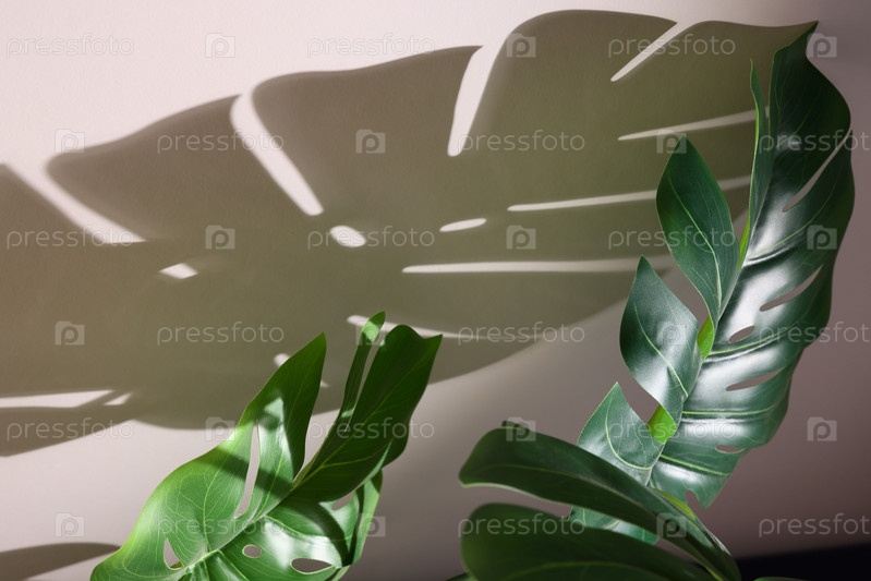 Элегантные зеленые листья отбрасывают красивые тени на стену, создавая спокойную атмосферу