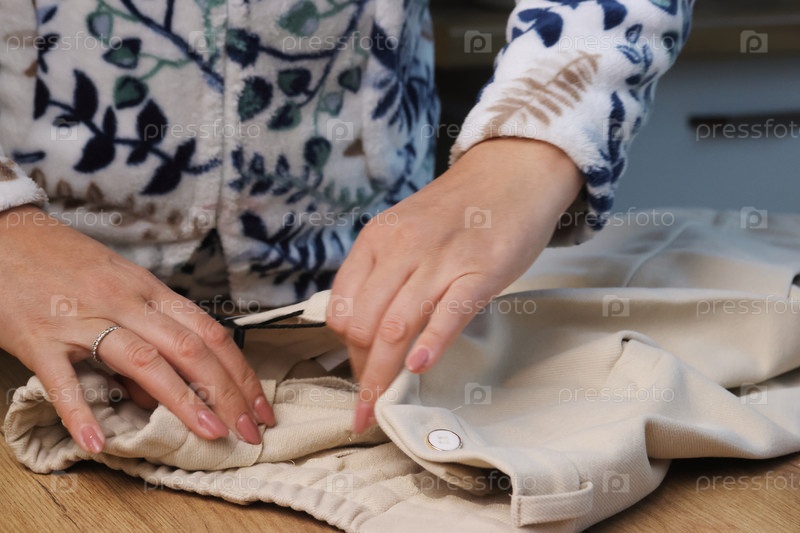 Женщина рассматривает классические бежевые брюки. Она демонстрирует внутреннюю часть брюк