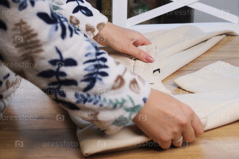 Женщина рассматривает классические бежевые брюки. Демонстрирует элементы дизайна. Крупный план