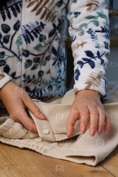 Женщина рассматривает классические бежевые брюки. Демонстрирует элементы дизайна. Крупный план