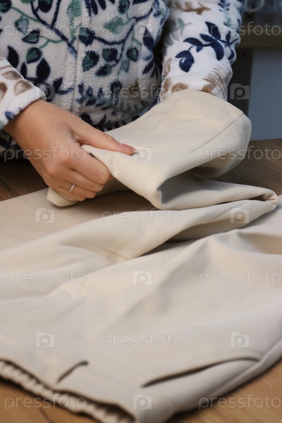 Женщина рассматривает классические бежевые брюки. Демонстрирует элементы дизайна